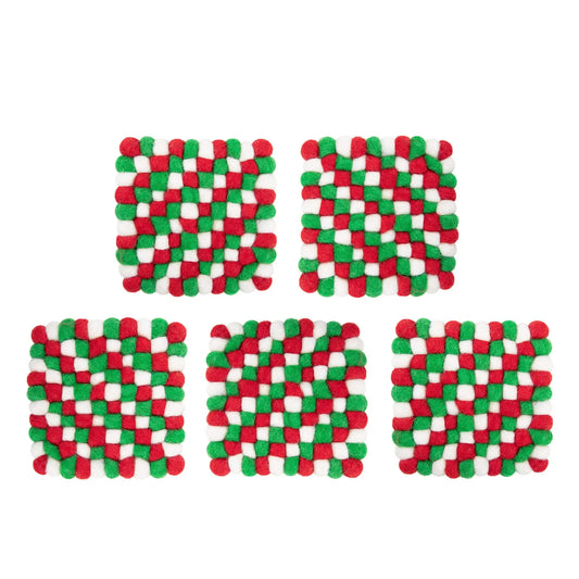 Christmas Wool Felt Ball Square Coasters | Red Green White Holiday Drink Mats | Checkerboard Festive Table Decor Gift